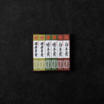 | 6本入り | 煉羊羹 2本、白羊羹 2本、抹茶羊羹 2本 |