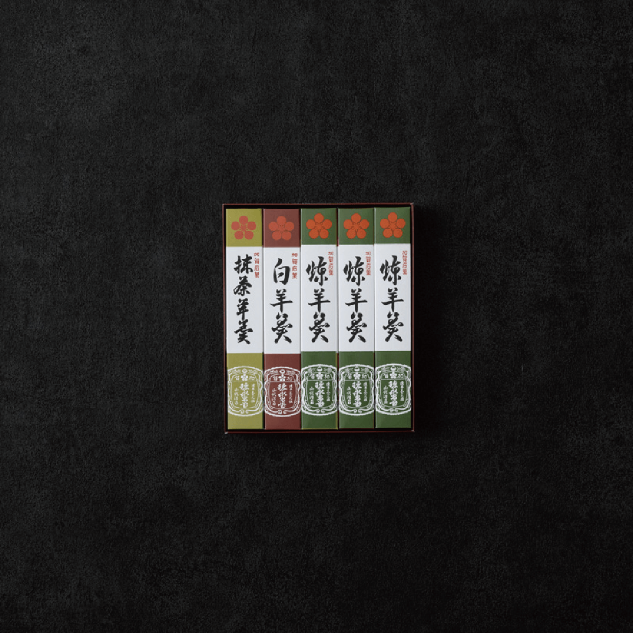 | 5本入り | 煉羊羹 3本、白羊羹 1本、抹茶羊羹 1本 |